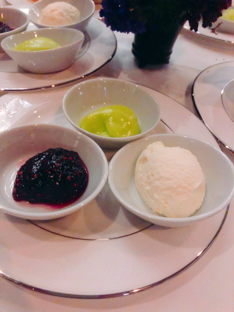 Instead of the usual lemon curd, a lime curd was served with the scones, along with devonshire cream and strawberry marmalade. The lime curd and strawberry jam on the maple blueberry scone really brought out the blueberry flavors of the scone. The funfetti scone tasted like cotton candy and paired well with the jam and lime curd.
