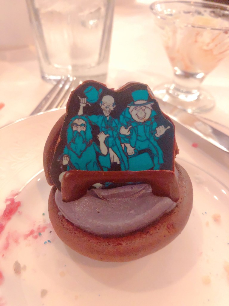 The last dessert was a whoopie pie that was also cutely themed. The Hitchhiking Ghosts are 3 spirits that Guests meet at the end of the Haunted Mansion so it was fitting to have a dessert that featured them. The whoopie pie was thick and very chocolatey. I was very full at this point so the chocolate was a bit overwhelming.