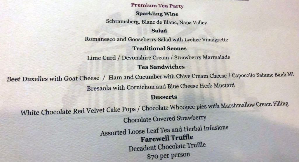The menu boasted its usual tea options: $52 for the Classic Tea Party, $65 for the Premium Tea Party or $35 for the Kids Tea Party.