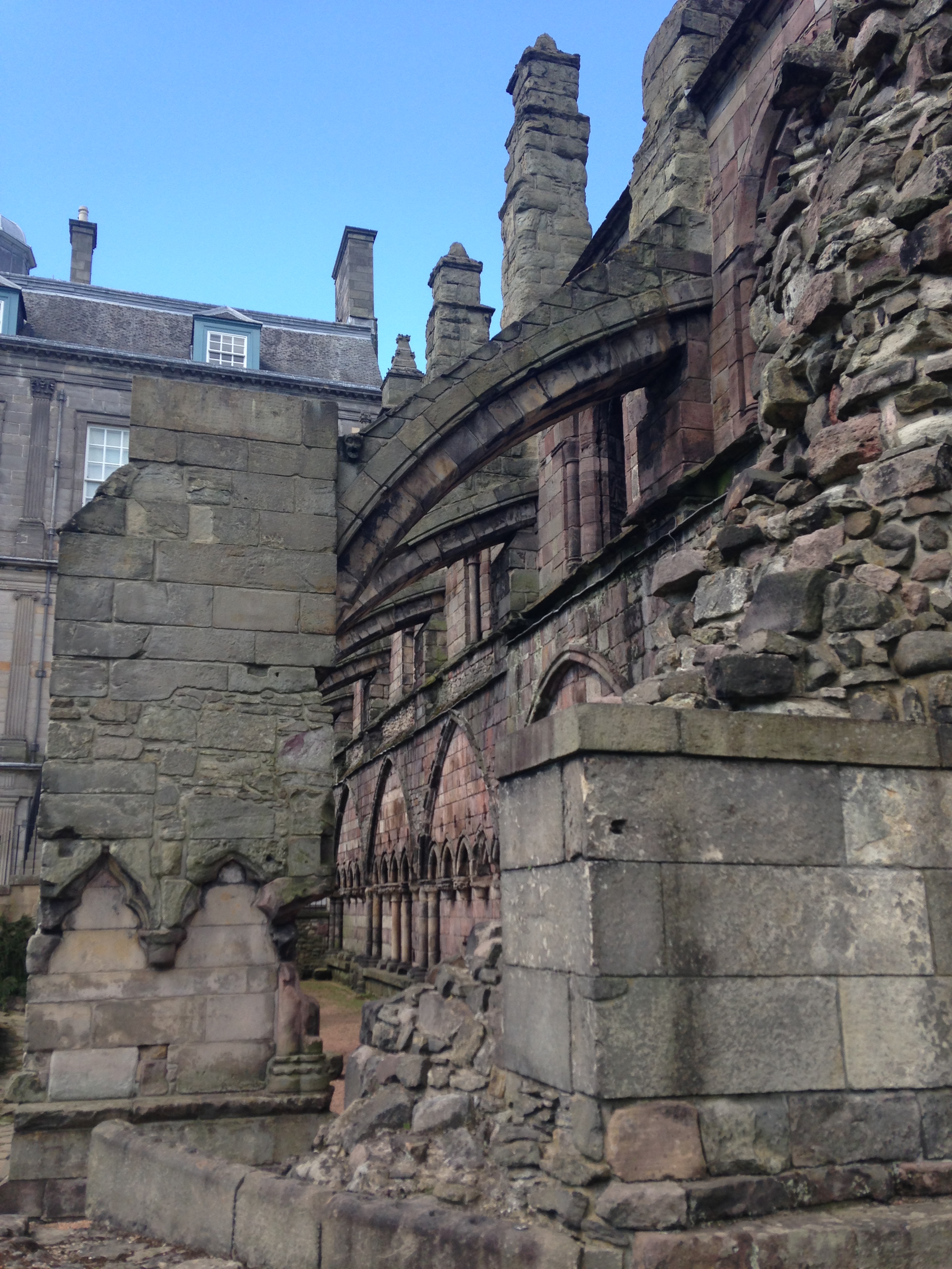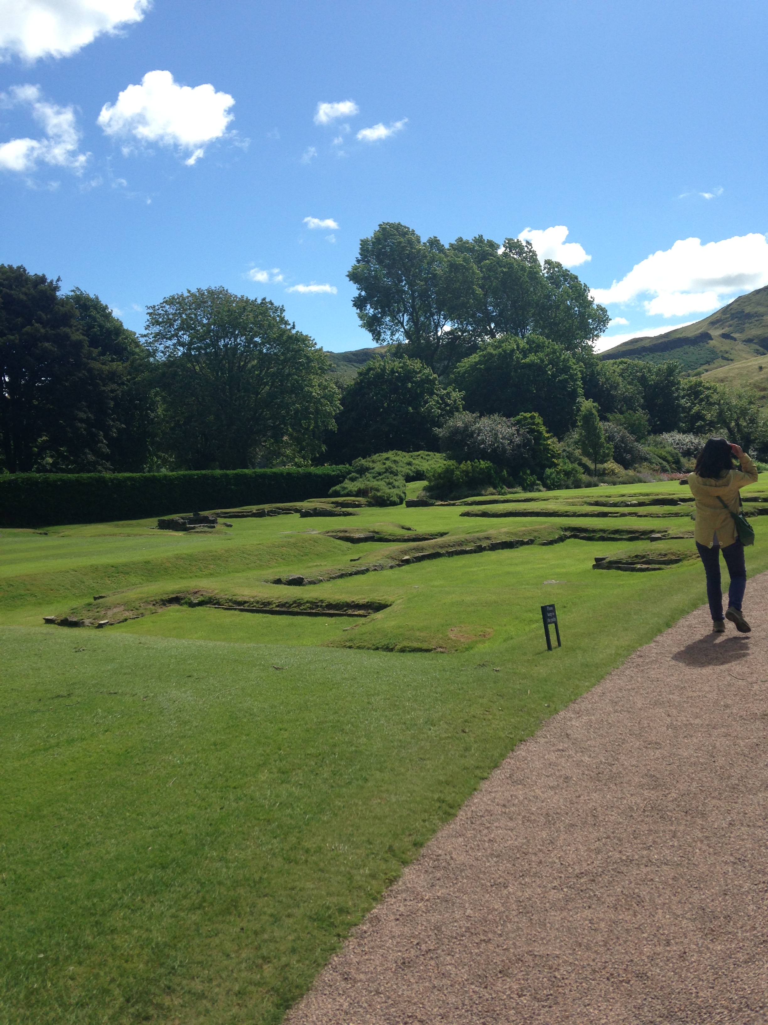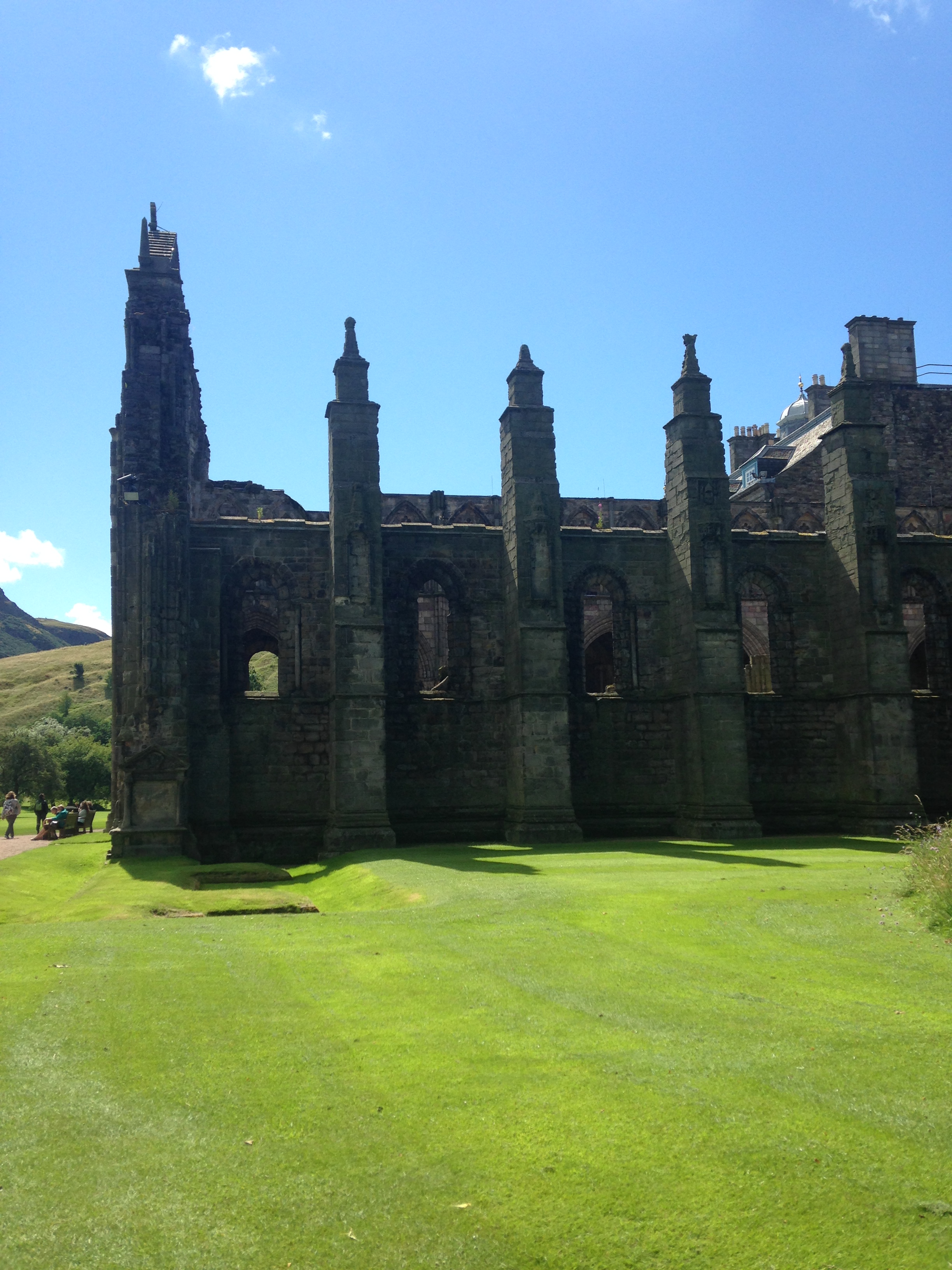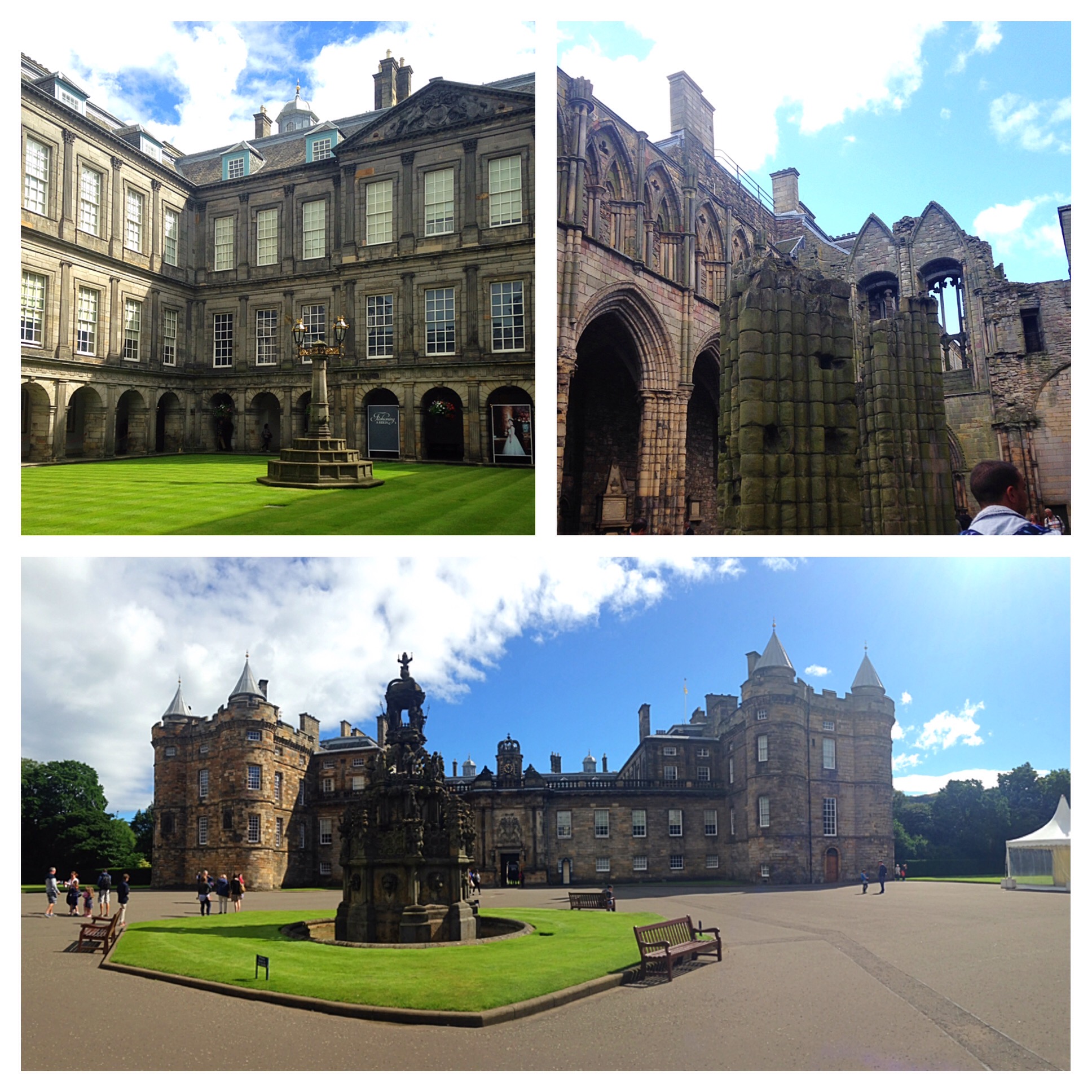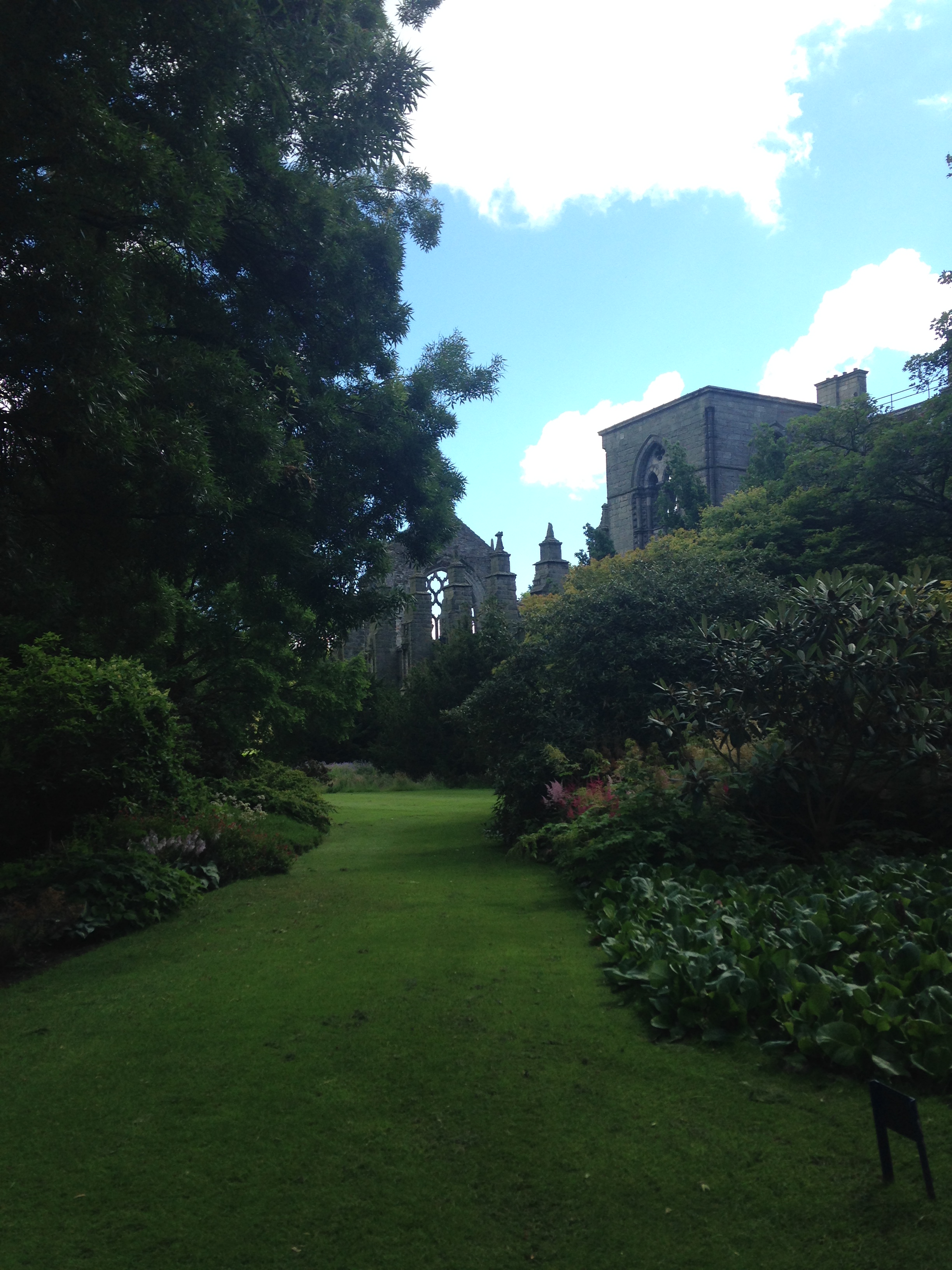 I bought some postcards in the gift shop that featured Mary. I don’t know why she is so fascinating to me. We also got to see a gallery of the current Queen’s dresses, the adjacent ruins of the attached Abby and walked through the Gardens where the Queen hosts a party every July.