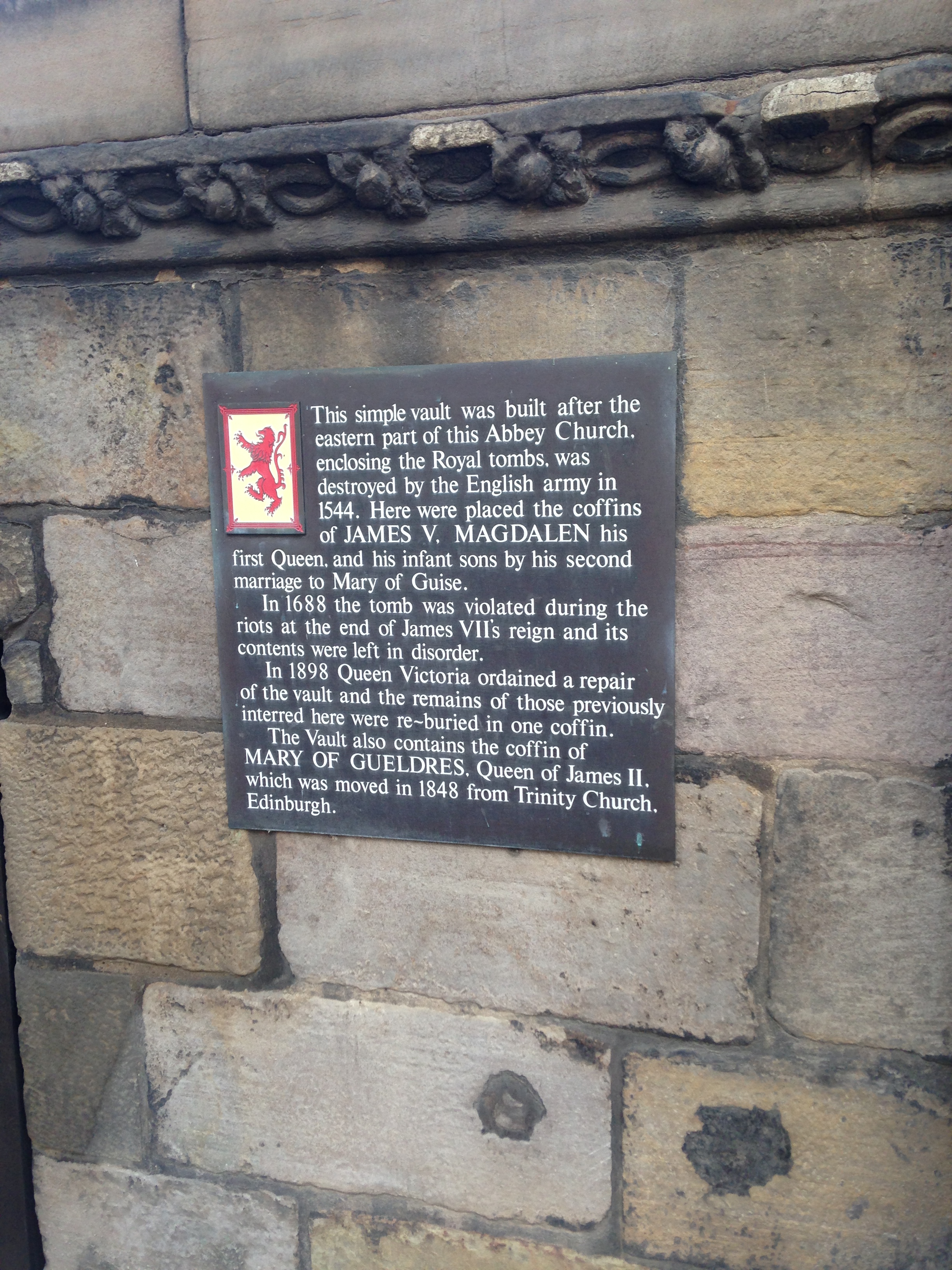 The inside of the Palace was gorgeous and the history was fascinating. There were the Historic Apartments where Mary Queen of Scots lived and several plaques in the different rooms told the sad tale of the end of her reign. After Mary returned from France in 1561, she lived in the Queen’s Apartments on the second floor of the towers built by her father, James V. There was a plaque in her antechamber that marked the place where the body of her secretary, David Rizzio, was left after he was dragged from her small dining room attached to the bedchamber and stabbed 56 times by her second husband Henry Stuart, Lord of Darnley and his advisors in 1566. The reason that this detail is so vivid in my memory is that you literally had to squat down to see the plaque, like the historians wanted you to see the very exact spot where this poor man was murdered. Mary fled the palace and gave birth to her only child, a son named James, at Edinburgh Castle. After Lord Darnley’s mysterious death in 1567, Mary married her third husband, James Hepburn, the Earl of Bothwell. But her third marriage wasn’t considered “favorable” and she was forced to abdicate her throne in 1568. Her son James, now only 2 years old, was taken from her and Mary fled to England to seek shelter. Queen Elizabeth I kept Mary captive for 20 years then had her convicted and executed at the young age of 45.